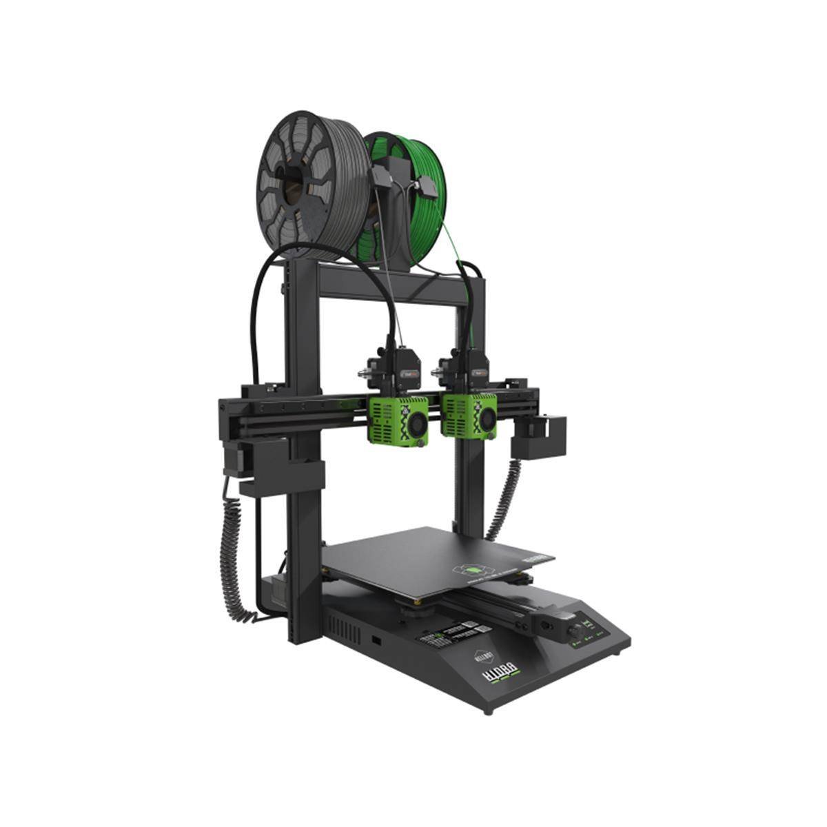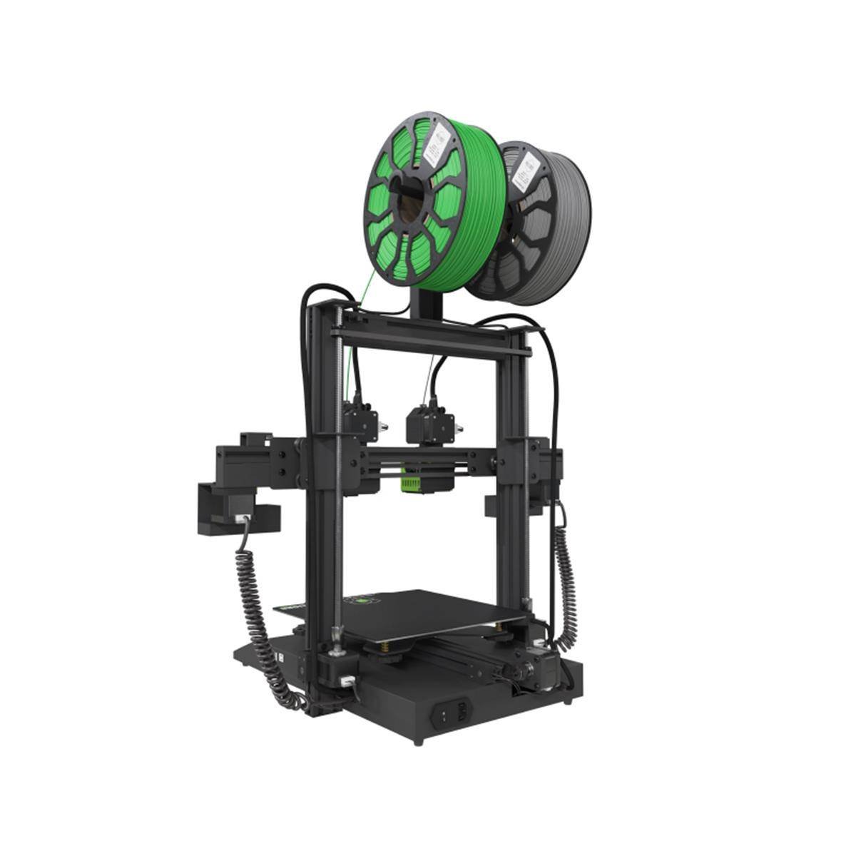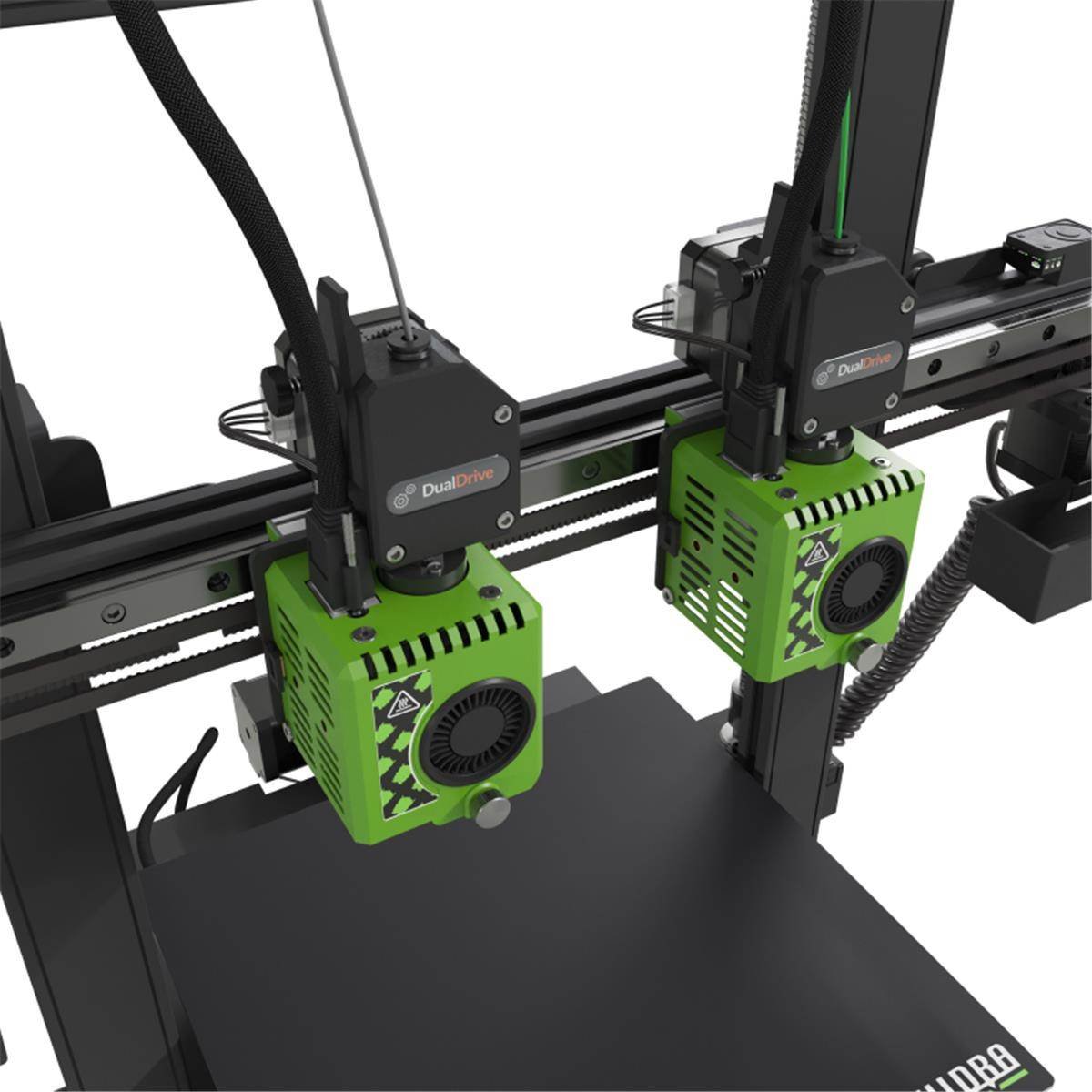 Sus dos cabezales trabajan de manera simultánea e independiente, permiten imprimir dos proyectos a la vez con sus modos duplicación y espejo. Impresiones multicolor, multimaterial y con soportes solubles son posibles con su modo dual, sin torre de purgado y cada extrusor con su temperatura justa para cada material.